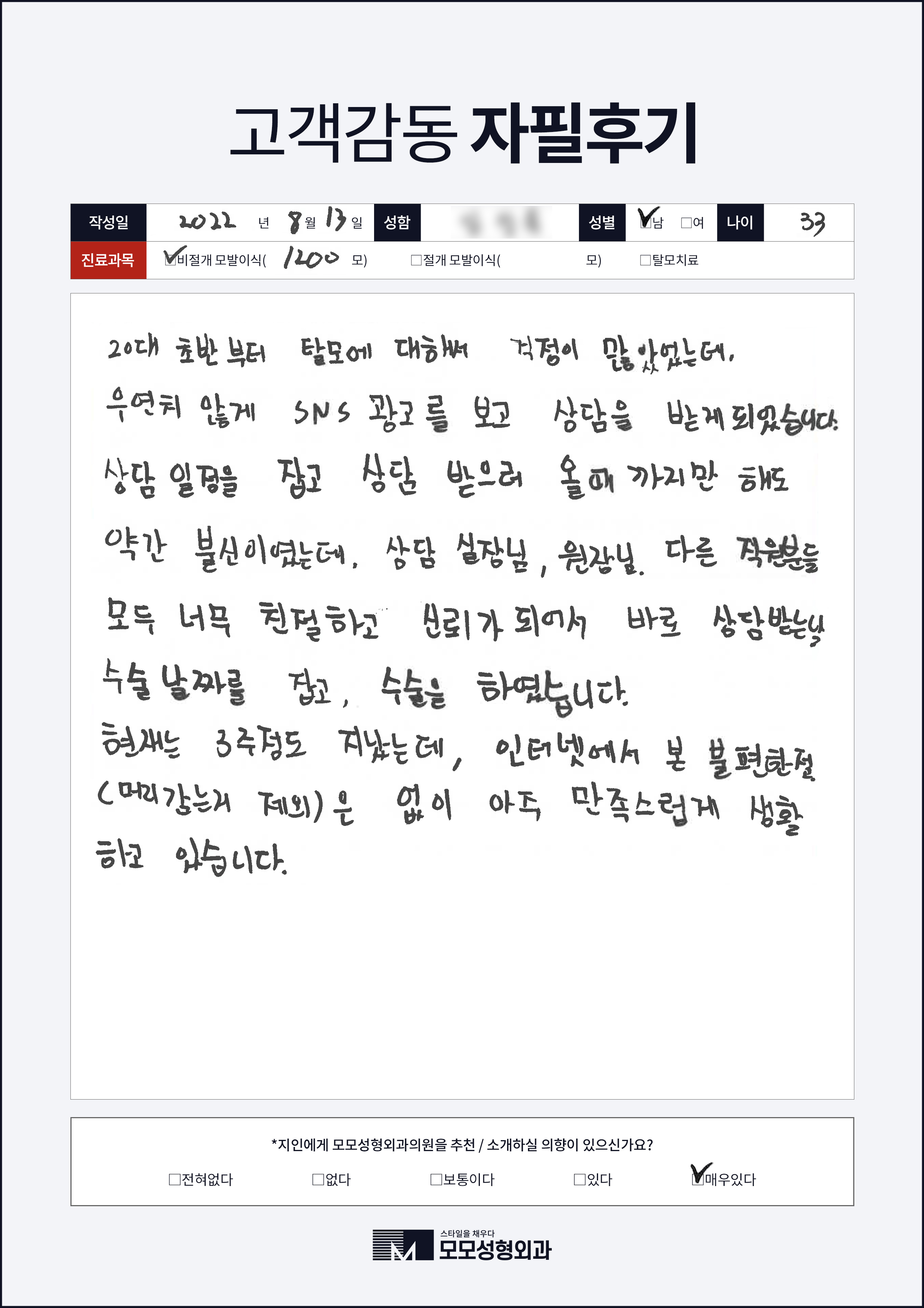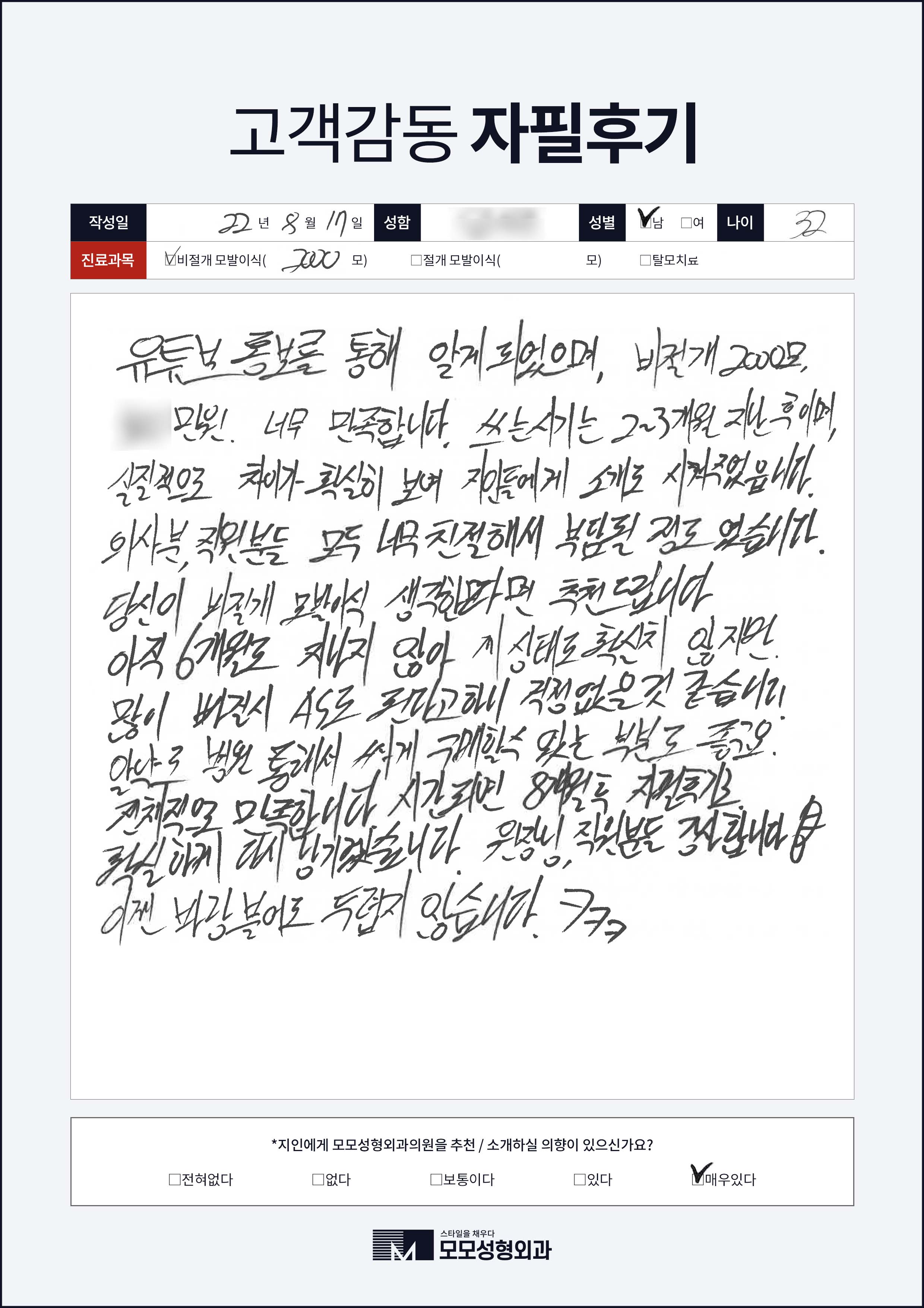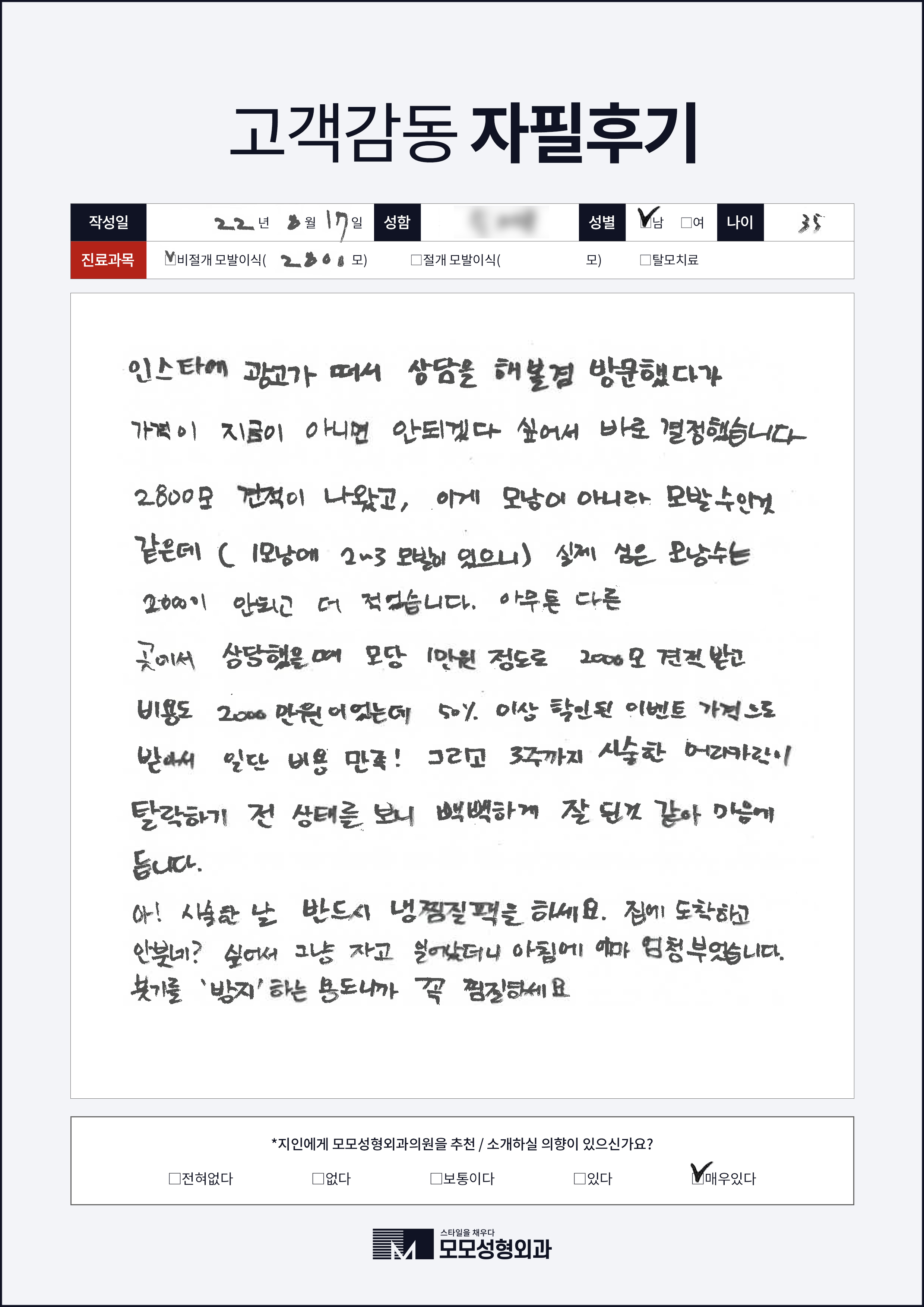 [30대]비절개모발이식1000모, 높은M자이마