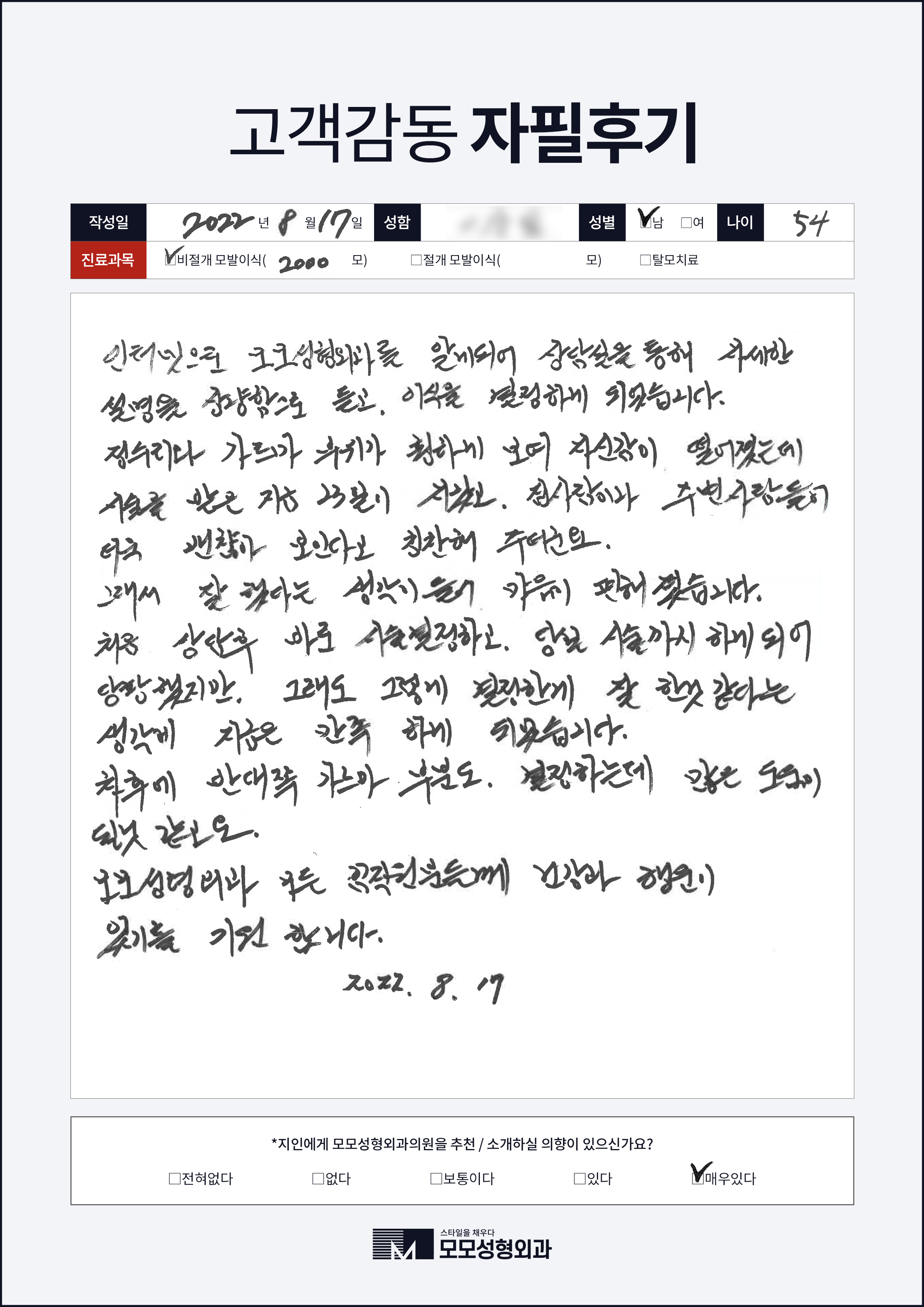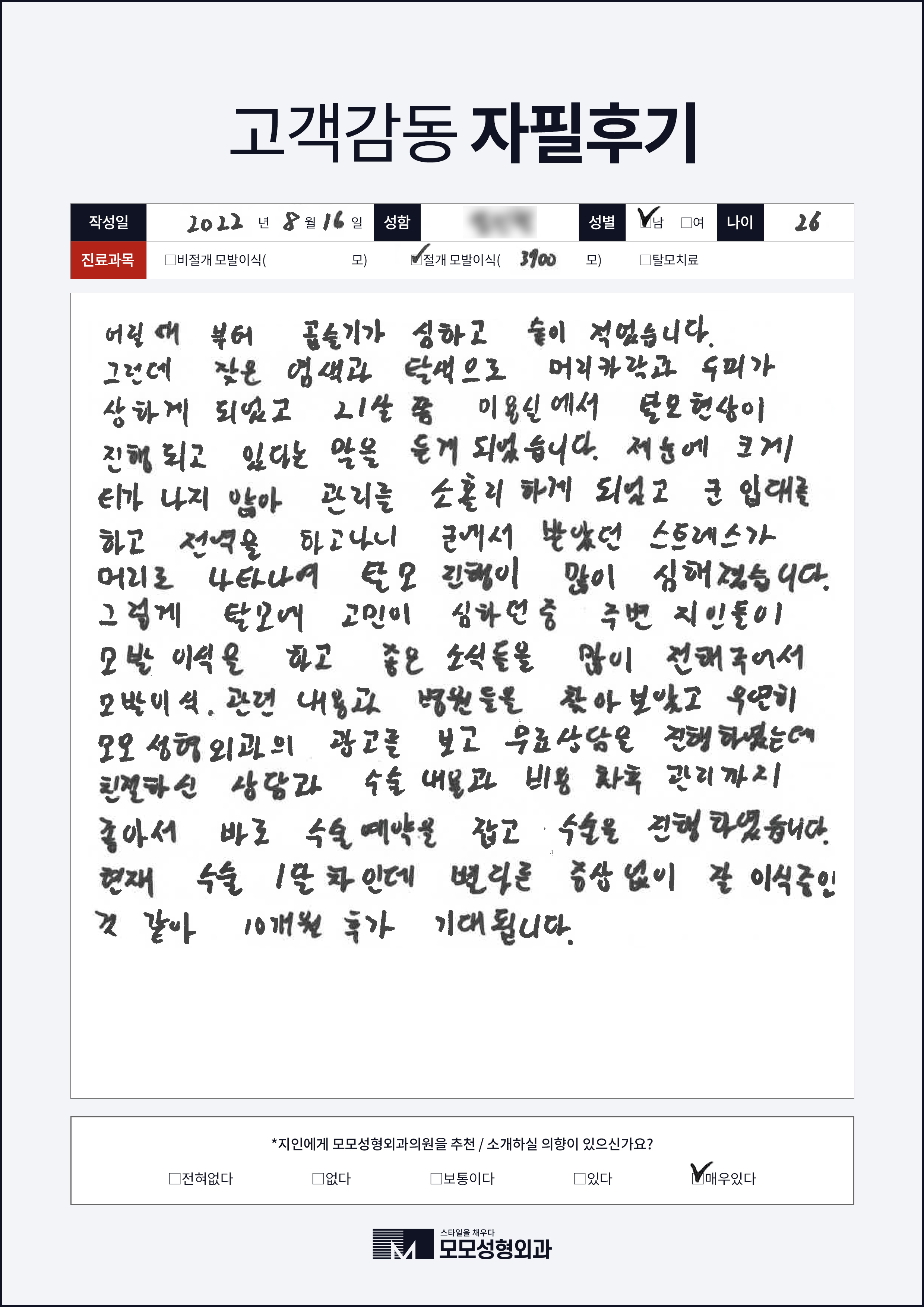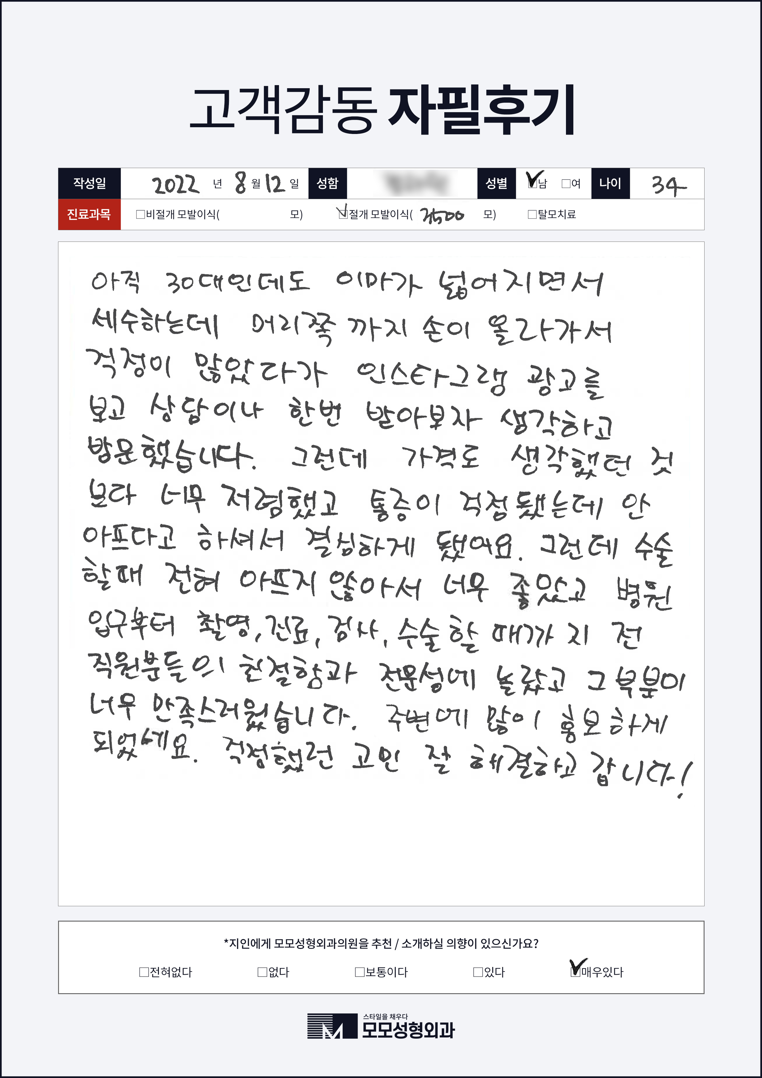 [30대]비절개모발이식1000모, 높은M자이마